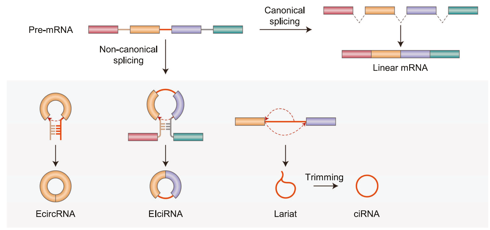 除反向剪接外,circRNA 还可通过其他途径生成:其一为套索残留机制(lariat escape),当脱支酶 DBR1 未能成功识别 pre-mRNA 剪接产生的套索结构时,套索经修剪后可形成 circRNA(这类 circRNA 被称为 ciRNA);其二为 tRNA/rRNA 加工副产物途径,该途径可产生 tricRNA 以及古菌中的 16S/23S 环状中间体。