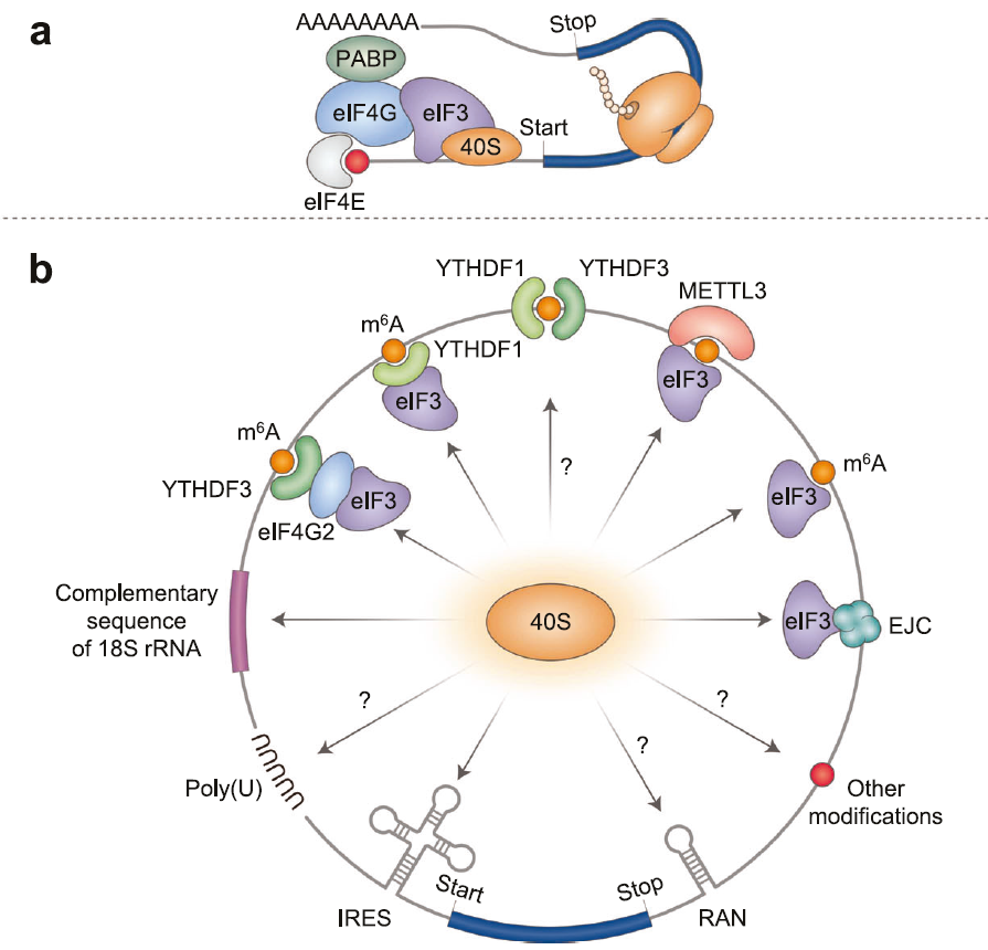 真核生物中 95% 以上的翻译过程依赖 “帽依赖” 途径(上图a):5′-cap 与 eIF4E 结合,再通过 eIF4G 与 3′-poly (A) 结合的 PABP 相互作用形成 “闭环” 结构,进而招募 43S 前起始复合物扫描 mRNA 上的 AUG 起始密码子以启动翻译。由于 circRNA 缺乏 5' 帽子结构和 3'poly (A) 尾,无法通过这一经典途径启动蛋白合成,其翻译依赖内部核糖体进入等非经典机制,核心分子元件和调控因子如下(上图b):