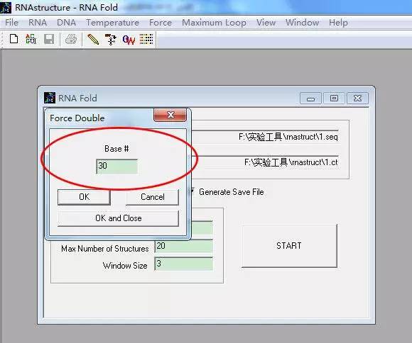 此处选择强制第30个碱基为双链模式,点击Double Stranded,弹出“Force double”窗口,在指定位置输入“30”,点击“OK and Close”: