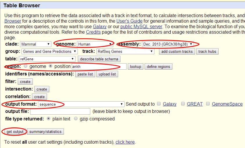 在clade选择Mammal,genome选择Human,assmebly选择最新的数据库,gene中输入ANKH,在track中选择RefSeq Genes,在output format中选择sequence,点击get output,根据需要选择序列,选择genomic-submit。
