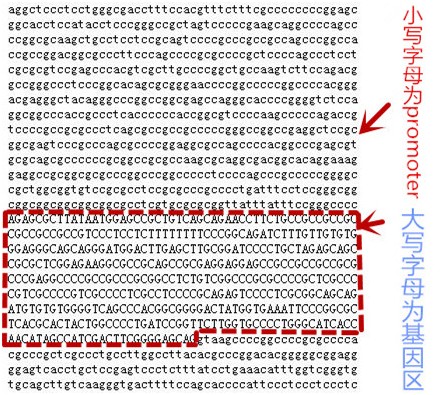 结果如下:大写字母是基因外显子区,大写字母前面的2000个小写字母就是预测的启动子区,复制粘贴保存到文本中。