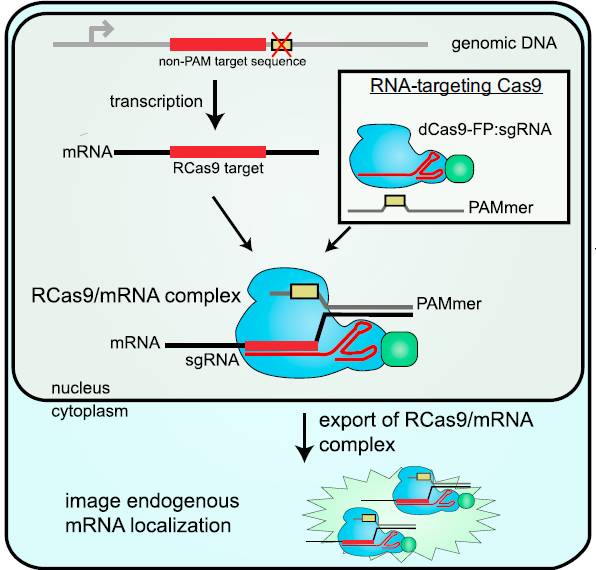 首先,虽然CRISPR/Cas9是DNA编辑工具,但是2014年有科研小组发现了针对RNA的靶向Cas酶。在此基础之上,作者设计了RCas9,即靶向RNA,而非DNA,同时又将无催化活性的Cas9酶与GFP连接。这样,一旦靶RNA被识别,就会出现GFP绿色信号。